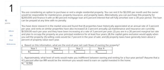 Solved You Are Considering An Option To Purchase Or Rent A Single Residential Property You Can Rent It For 2 000 Per Month And The Owner Would Be Course Hero